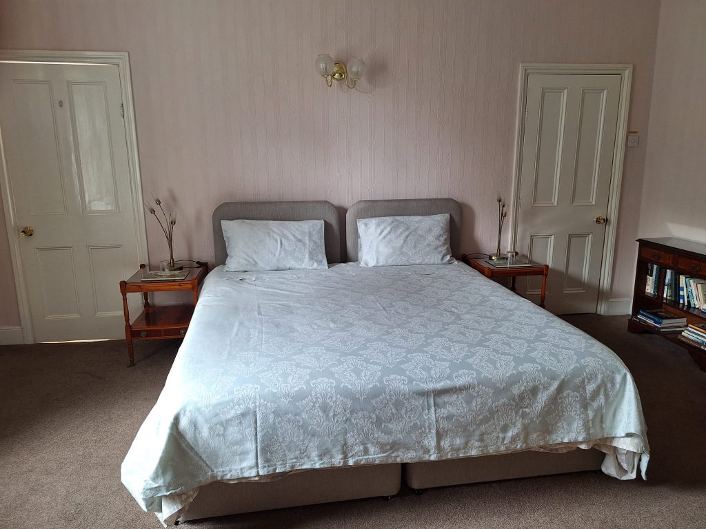 The Master Room A spacious south facing double room overlooking our front gardens. Beautifully furnished with a Victorian suite and super-king size bed, can be converted into 2 large singles, a large en-suite bathroom with a shower over the bath.